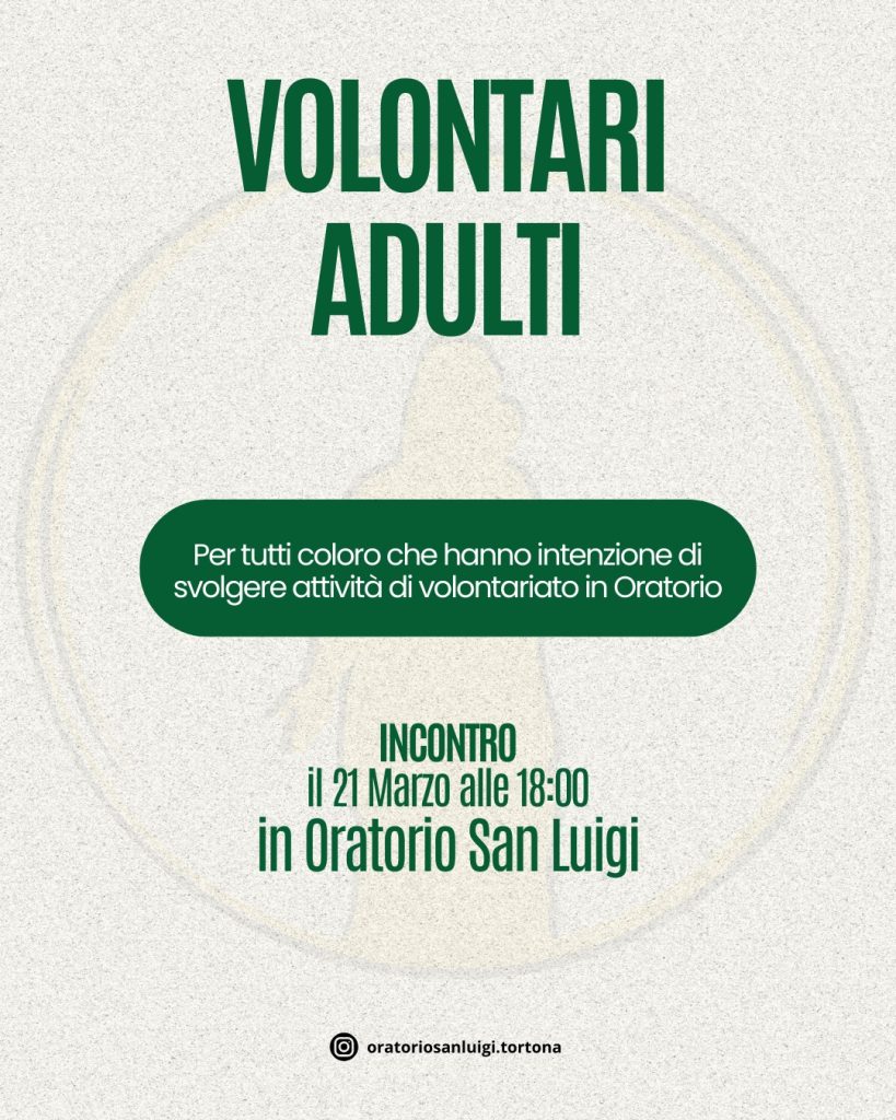 Sabato 21 marzo alle ore 18:00, l’Oratorio San Luigi ospiterà un incontro dedicato a tutti gli adulti che hanno il desiderio di donare un po’ del proprio tempo e delle proprie competenze nelle attività oratoriane. L’invito è rivolto a chiunque voglia collaborare attivamente alla vita della nostra realtà educativa e pastorale. Vi aspettiamo numerosi per condividere questo momento: partecipare come volontari significa scegliere di accompagnare le nuove generazioni, diventando testimoni credibili di servizio e di gratuità.
