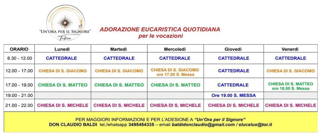 Ecco il programma con i luoghi e gli orari per poter prendere parte a questo momento di preghiera personale con Gesù Eucaristia.