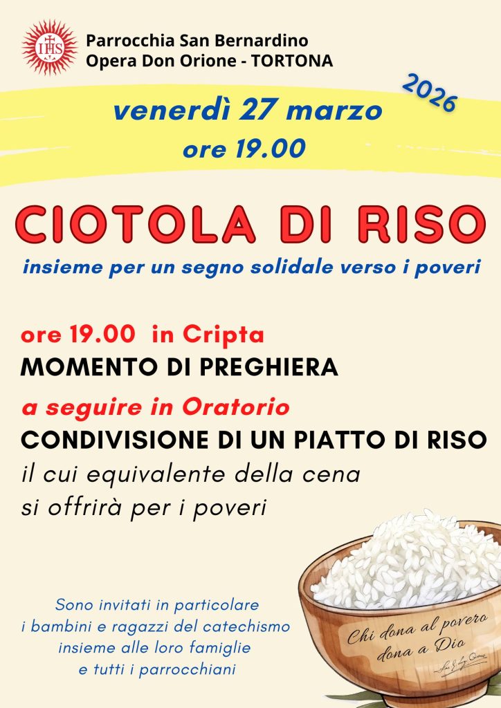Venerdì 27 marzo vivremo un momento concreto di carità: la “Ciotola di Riso”. Inizieremo con la preghiera in Cripta alle ore 19.00 per poi condividere un piatto di riso in Oratorio; il ricavato della offerte (equivalente ad un cena) sarà destinato alle Missioni. Un invito speciale è rivolto ai bambini e ai ragazzi del catechismo con le loro famiglie.