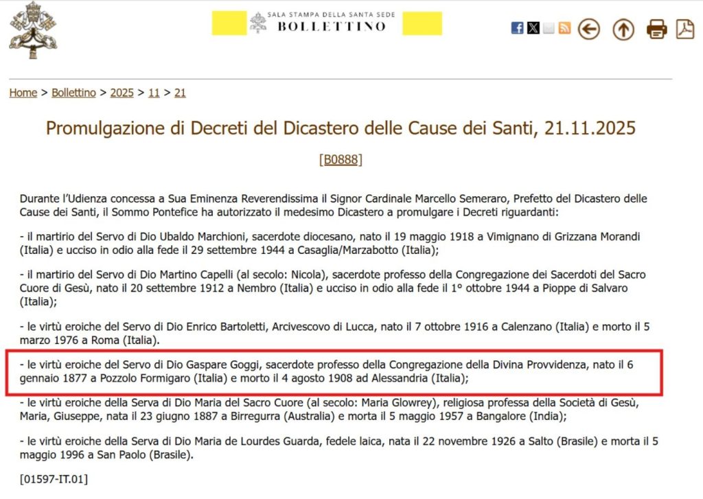 Oggi, 21 novembre 2025 alle ore 12, il Bollettino della Sala Stampa vaticana, ha annunciato che ‘Durante l’Udienza concessa a Sua Eminenza il Signor Cardinale Marcelo Semeraro, Prefetto del Dicastero per le Cause dei Santi, il Sommo Pontefice ha autorizzato il medesimo Dicastero a promulgare il Decreto riguardante le virtù eroiche del Servo di Dio Gaspare Goggi, sacerdote professo della Congregazione della Divina Provvidenza, nato il 6 gennaio 1877 a Pozzolo Formigaro (Italia)’.