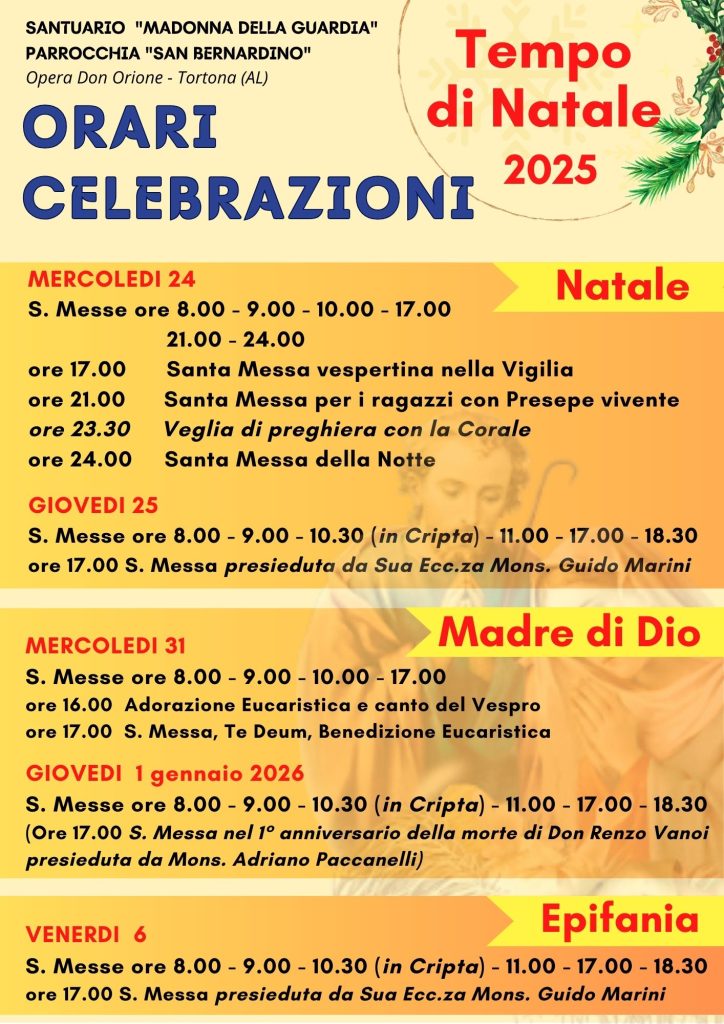 - Santo Natale – 25 dicembre: Messe alle 8.00, 9.00, 10.30 (in Cripta), 11.00, 17.00 (presieduta dal nostro vescovo Marini), 18.30.