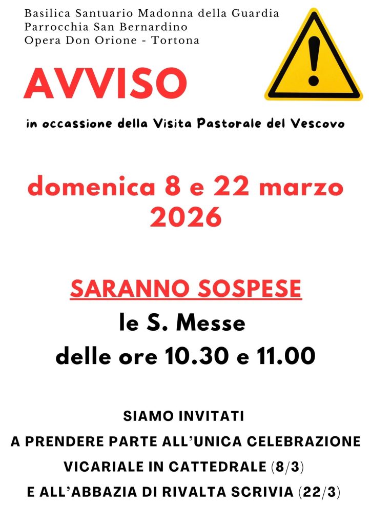 In occasione della Visita Pastorale del Vescovo, la nostra comunità è invitata a unirsi in un unico momento di preghiera con le altre parrocchie del vicariato. Per questo motivo, nelle domeniche dell’8 e del 22 marzo 2026, presso la Basilica Santuario Madonna della Guardia e la Parrocchia San Bernardino saranno sospese le Sante Messe delle ore 10.30 e 11.00.